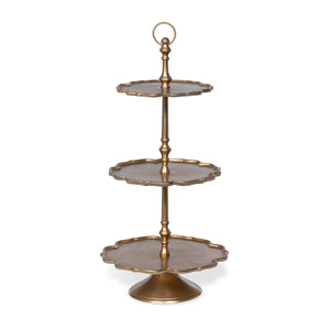 This beautiful three tier stand, featuring three trays in a neutral light gold finish with scalloped edge detailing and a turned leg decorative center rod, is a beautiful display piece whether displaying fresh baked treats or seasonal home decor.