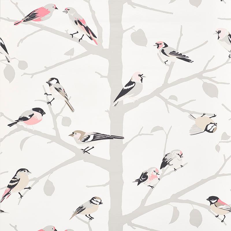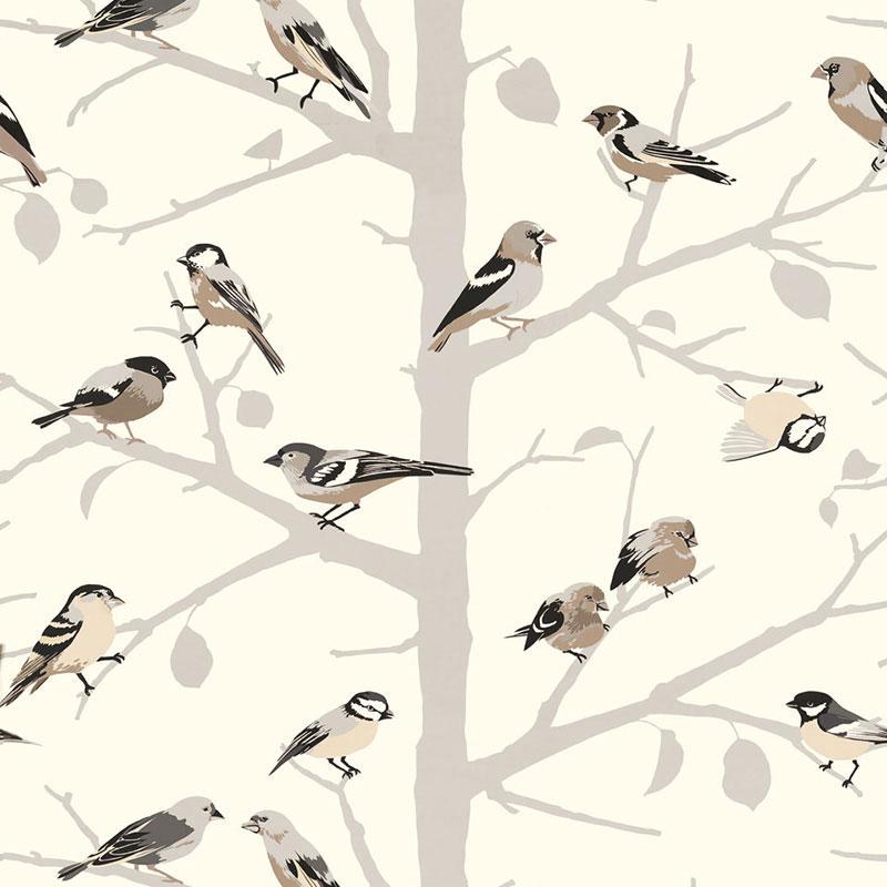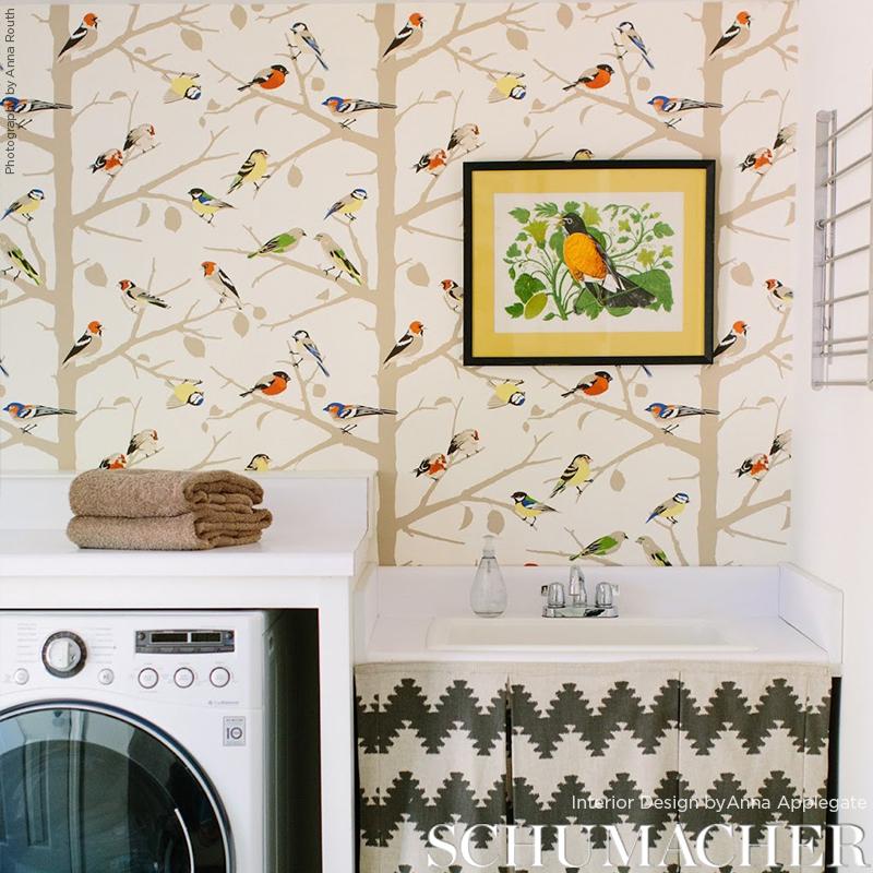 A forest of silhouetted trees provides a soft backdrop for colorful songbirds in this charming screen-printed wallpaper. A-Twitter in blues is a lively and versatile large-scale pattern that can bring a focal wall to life or make an entire room sing.