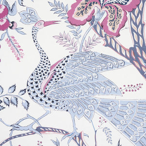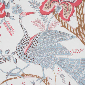 Inspired by 19th-century Indian textiles, Aveline is inhabited by regal peacocks and an undulating flowering vine, both rendered with fanciful, delicate details.