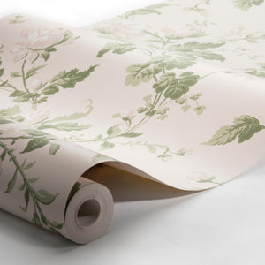 A delicate floral pattern adorns Boråstapeter’s Blomslinga wallpaper. Inspired by floral prints popular in the 1800s, this beautifully detailed leaf-colored wallcovering features blooming peonies and lush roses.