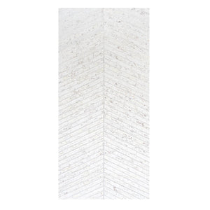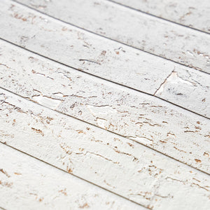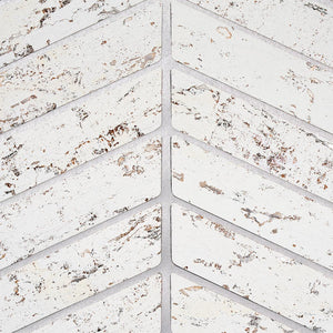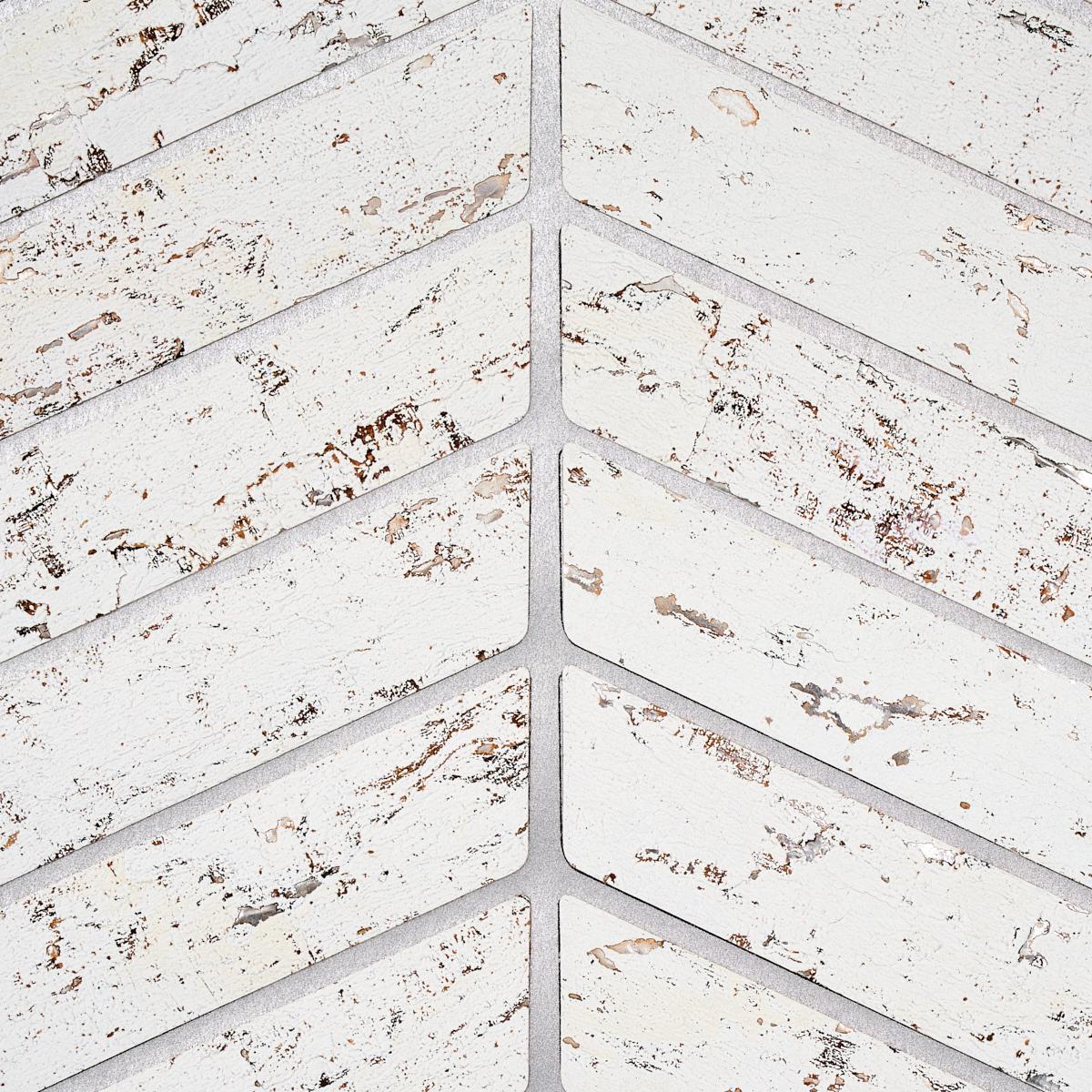 A large scale wallcovering, Cork Herringbone in white gorgeously enhances cork’s natural texture, with metallic flecks that peek through the hand-pieced, whitewashed bark.