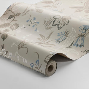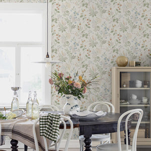 Featuring dainty forget-me-nots and beautiful bell-shaped blooms interspersed with lush variegated leaves of different shapes and sizes, Folklore brings a Scandinavian meadow into the home. A versatile mid-scale floral, this wallpaper adds charm and cheer to any room.