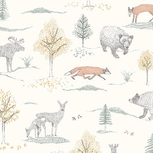 Inspired by the abundant flora and fauna in Sweden’s natural lands, Up North in ivory is a rustic and cheerful wallpaper. Scandinavian heritage brand Boråstapeter’s pattern features a fantastical forest where woodland creatures—moose, deer, bears and more—are friendly and fanciful.