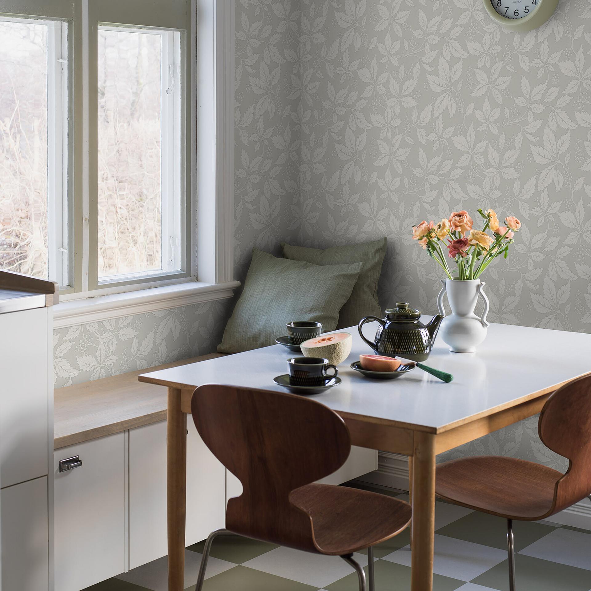 Vildvin is a striking illustration of the Virginia vine, a pretty plant with five leaves and clusters of dainty berries. This enchanting botanical climbs up the wall and effortlessly uplifts the surrounding space.