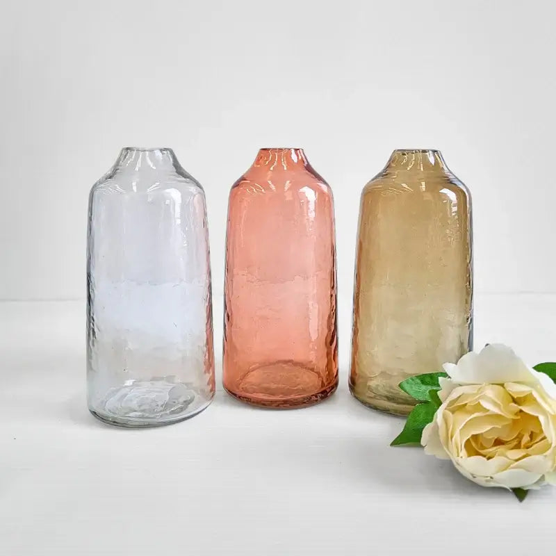 Introducing our exquisite collection of handblown hammered glass bud vases, a perfect blend of ethical craftsmanship and sustainable design. Each vase is meticulously hand-crafted from 100% recycled glass, offering a unique hand-hammered texture in three beautiful colors. Ideal for showcasing a single bloom or a small bouquet, these bud vases bring a touch of subtle texture to any space while honoring a commitment to people and the planet.