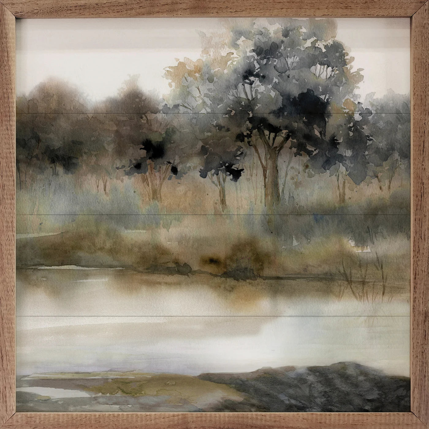 This vintage style wood print, featuring a walnut wood frame with an atmospheric water setting printed on a shiplap background, is sure to provide beauty and farmhouse charm to any space.
