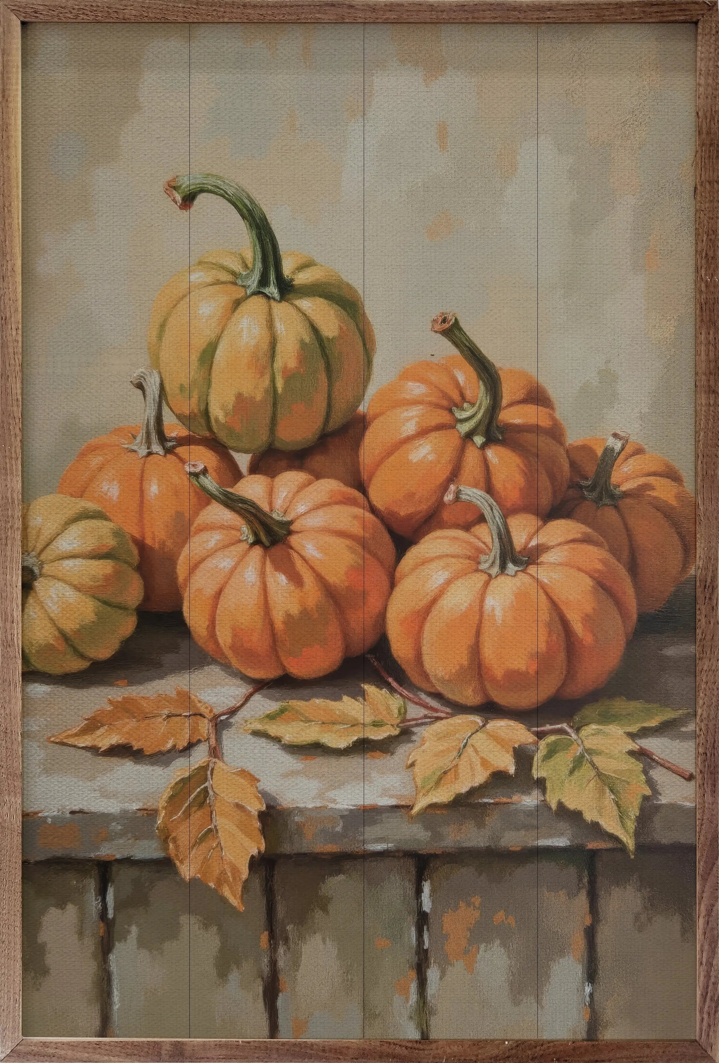 A cheerful stack of pumpkins against a shiplap backdrop brings all the cozy charm of a crisp fall day, framed in warm walnut wood, it’s a sweet touch for your cottage inspired space.