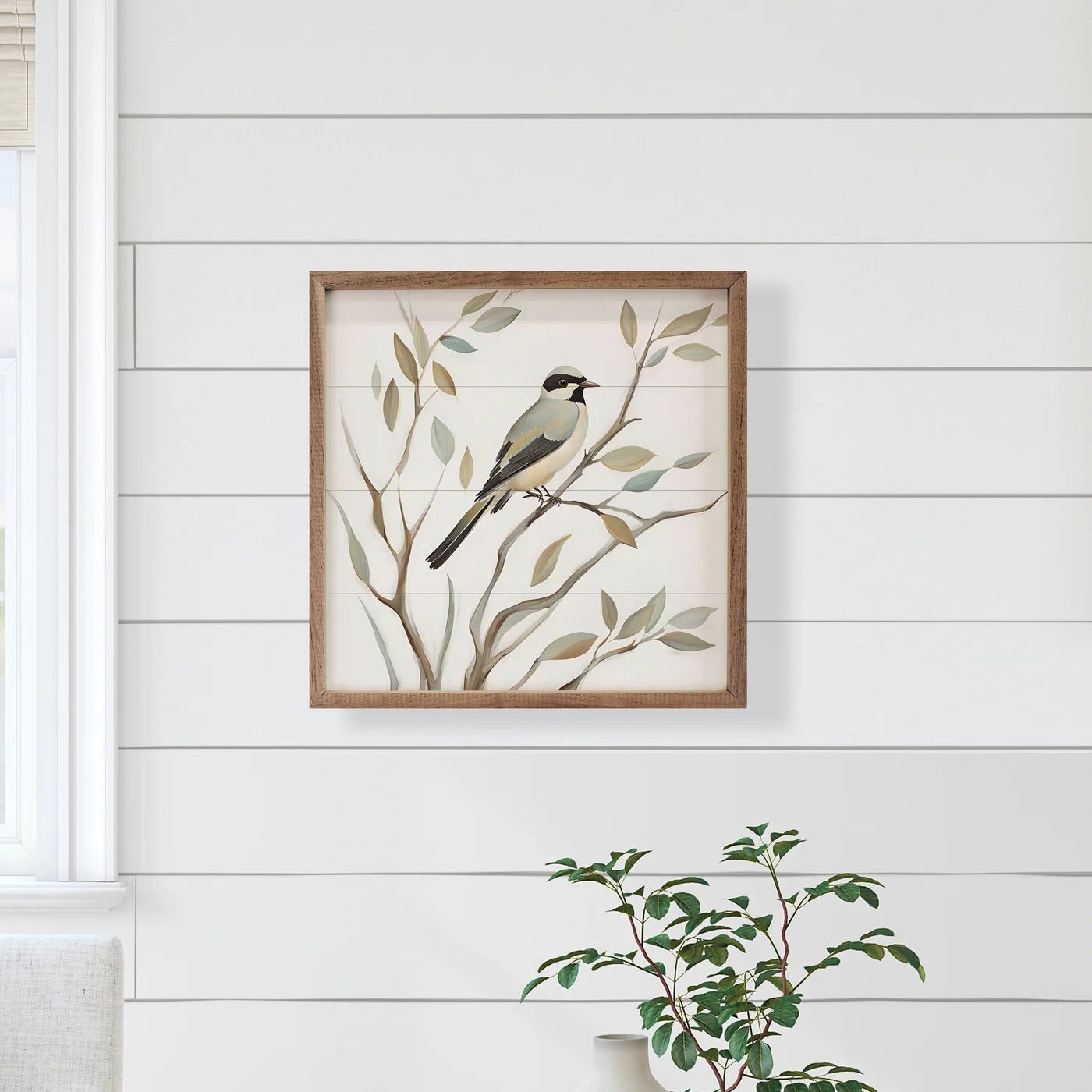 This vintage style wood print, featuring a walnut wood frame and a sweet perched bird print, is sure to provide beauty and farmhouse charm to any space.