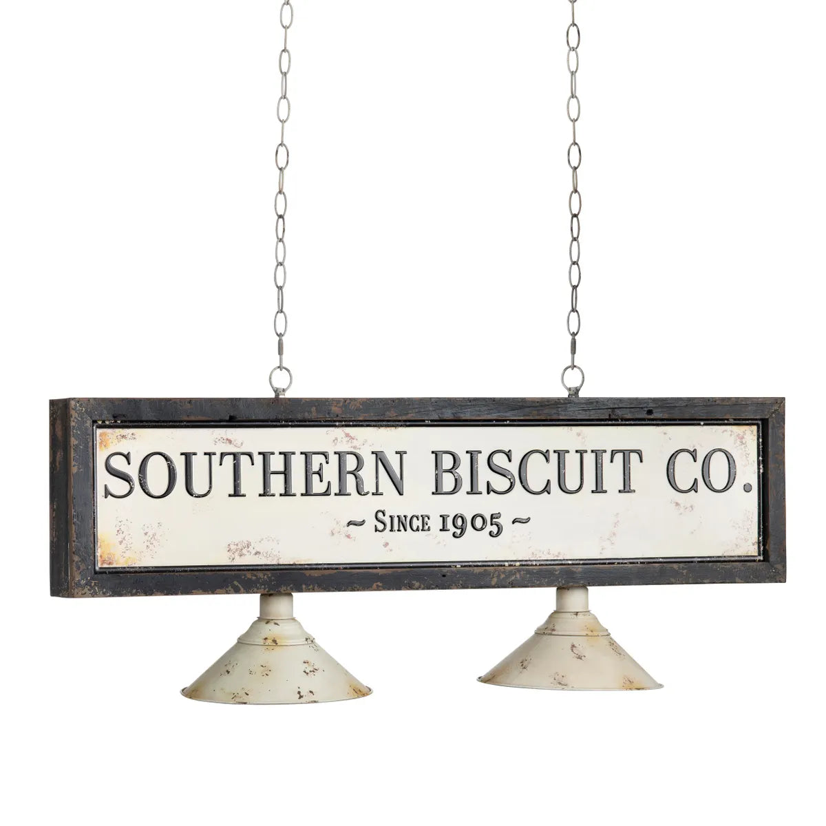 Sure to give your kitchen a true farmhouse feel, this light fixture features a distressed cream Southern Biscuit Co. canopy wood sign with two hanging light fixtures in a rusty metal finish and metal chain for hanging.