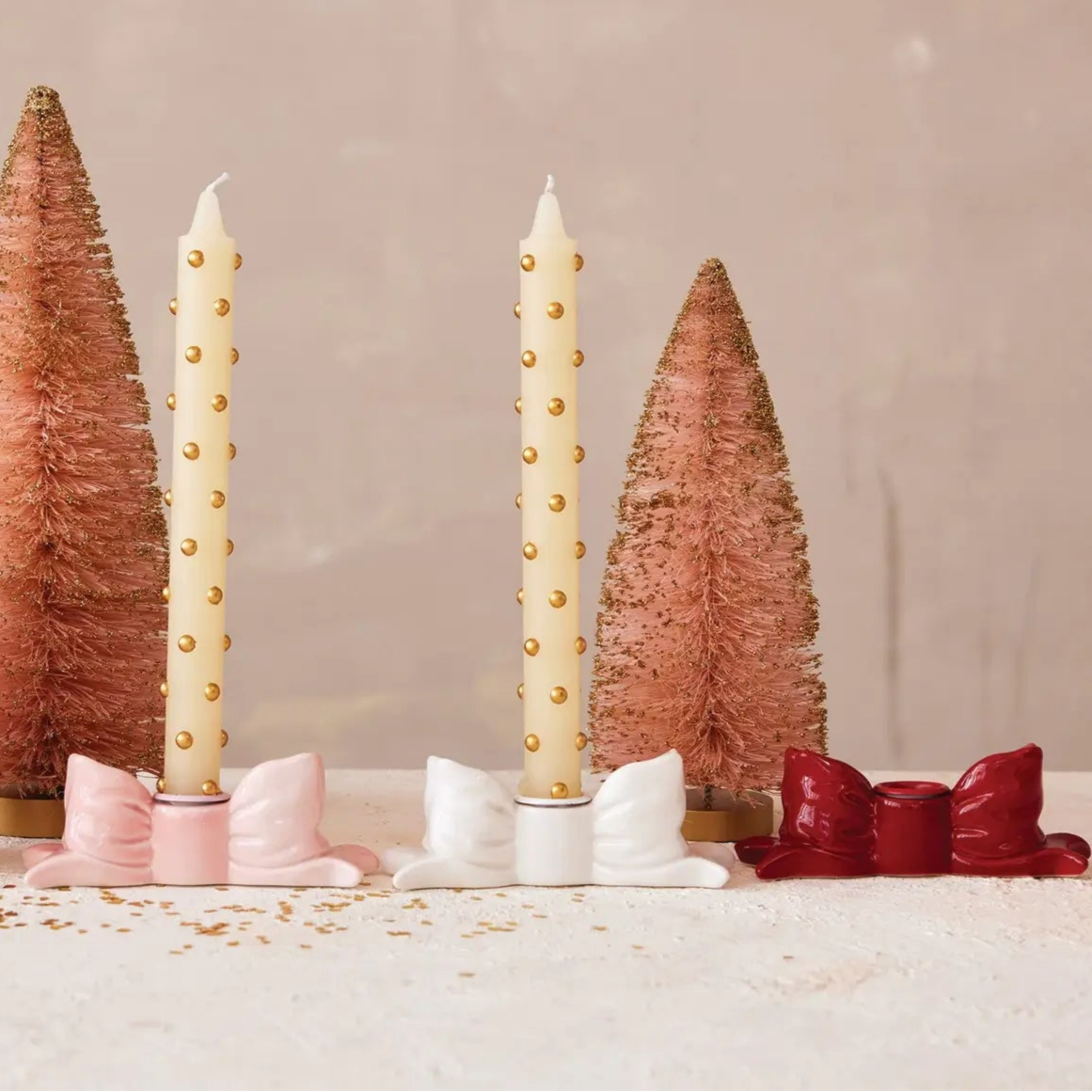 Add a playful touch to your table with these bow-shaped taper candle holders, featuring colors of soft white, classic red, and blush pink, each one brings a bit of charm and whimsy to your decor.