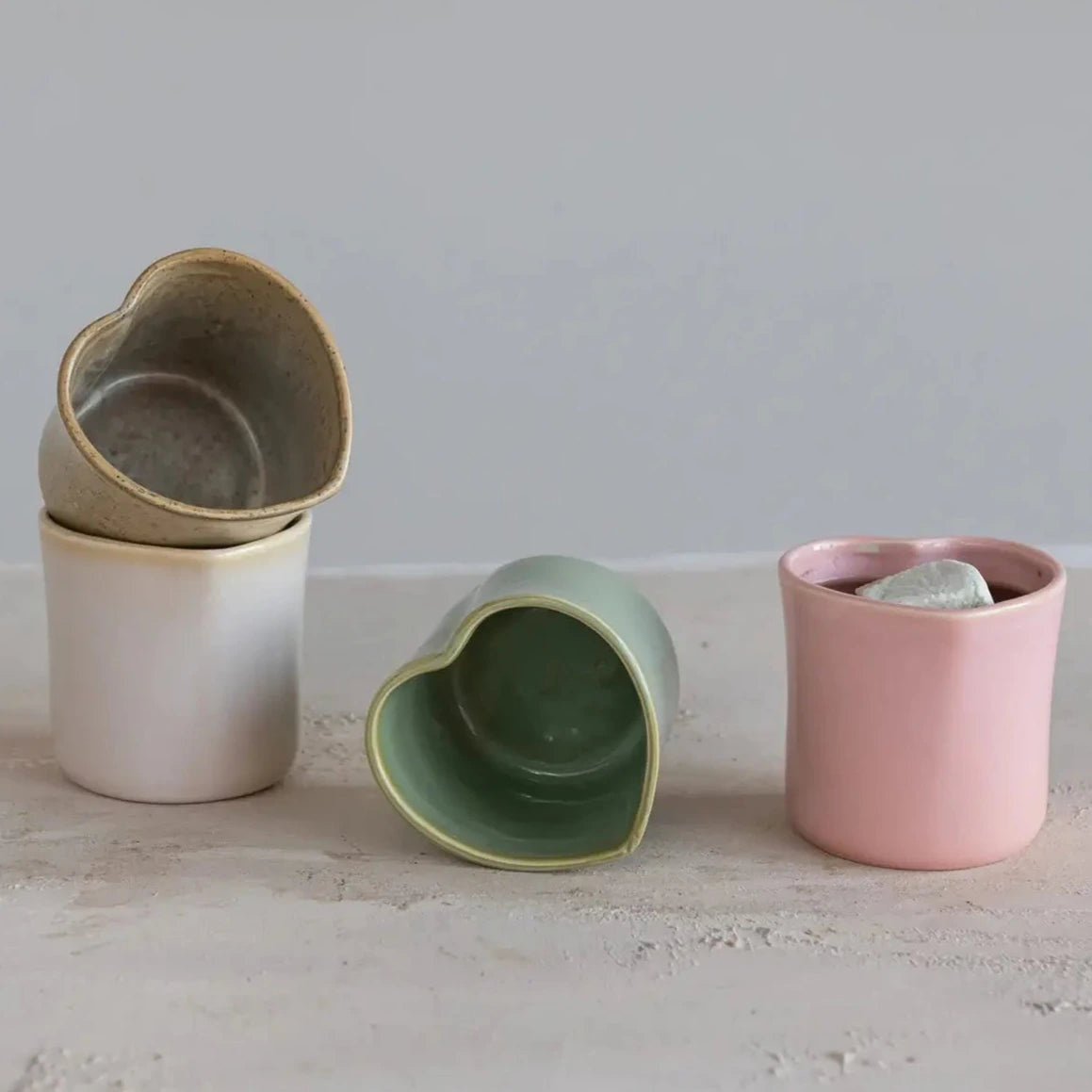 These stoneware heart mugs, each featuring a different neutral color, are perfect for adding a touch of farmhouse beauty and whimsy to your morning coffee and look beautiful stacked for display as well.
