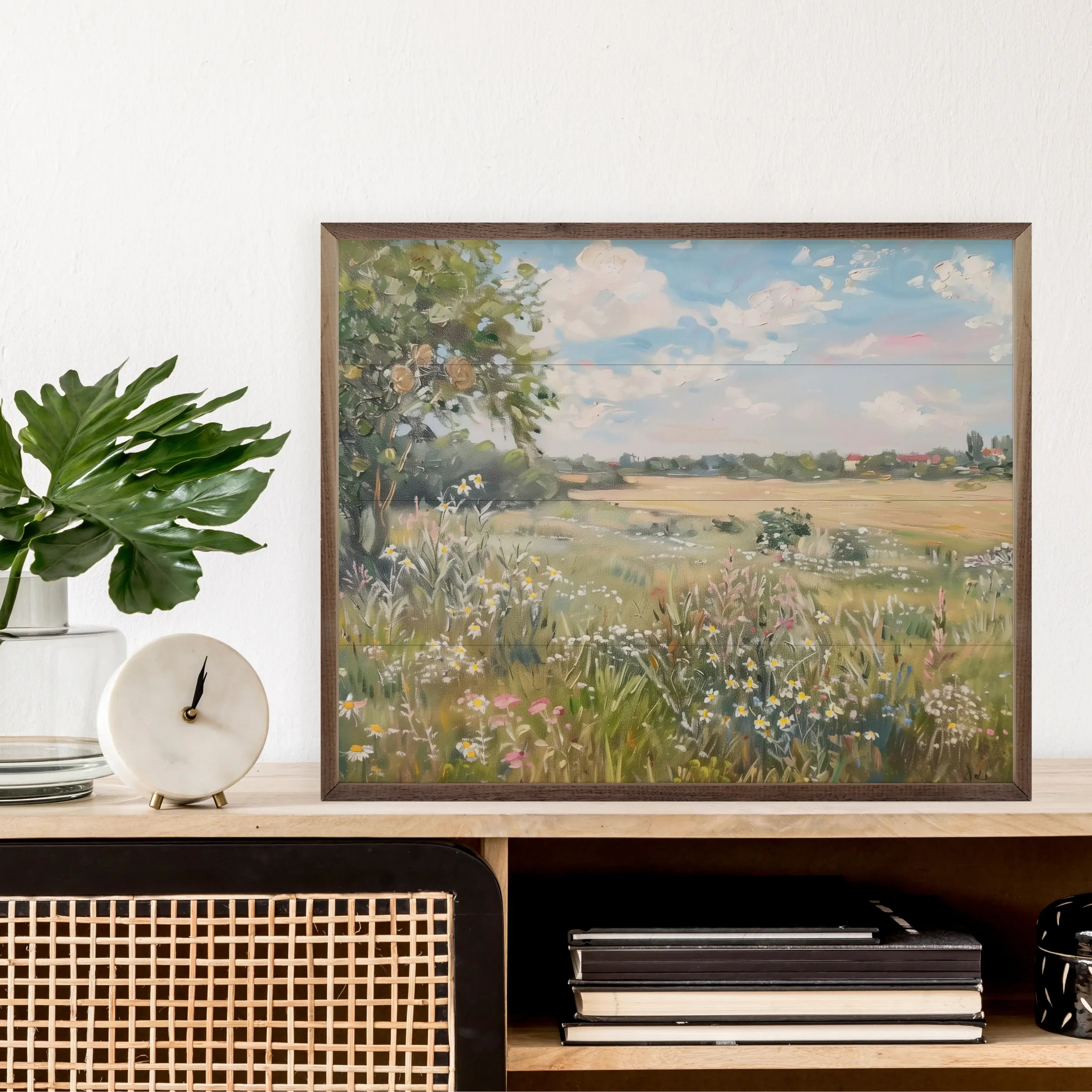 This vintage style wood print, framed in warm walnut and printed on a shiplap background, captures the soft, sunlit beauty of a wildflower field in full bloom. With its dreamy brushstrokes in gentle greens, pale blues, and pops of wildflower color, it brings the peaceful feeling of a summer afternoon right into your home. It’s a piece that feels both nostalgic and refreshing perfect for adding a touch of countryside charm to any space.