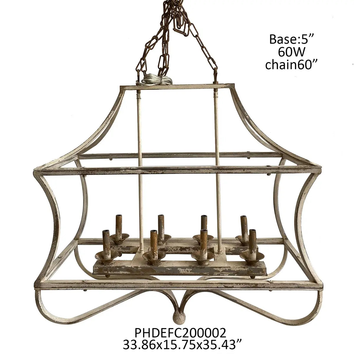 The Summer House Horizontal Chandelier, featuring a beautifully aged white metal finish with a unique open metal frame design and interior eight bulb candelabra and matching chain, is a beautiful lighting fixture for making a statement with true farmhouse charm.