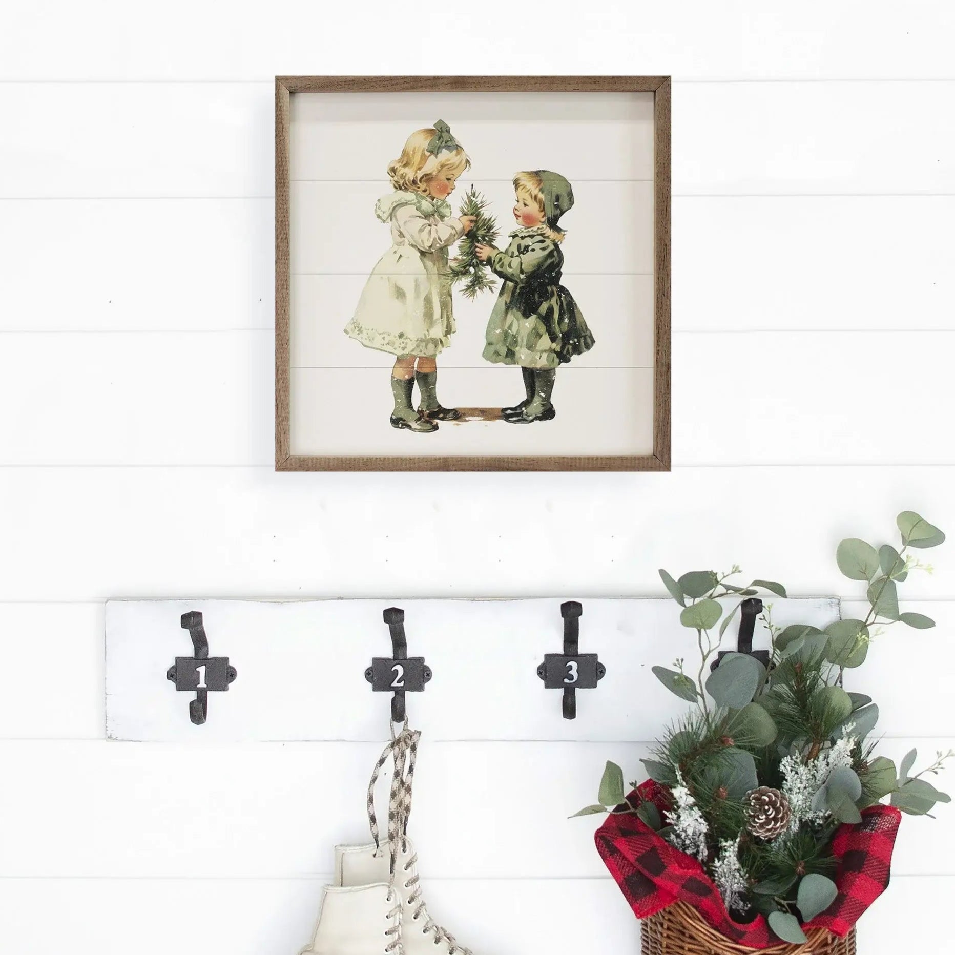 This sweet vintage style print captures two little girls sharing a tiny Christmas tree, full of old-fashioned charm, this print is set on a shiplap background with a walnut wood frame, adding a nostalgic and heartwarming touch to your holiday decor.