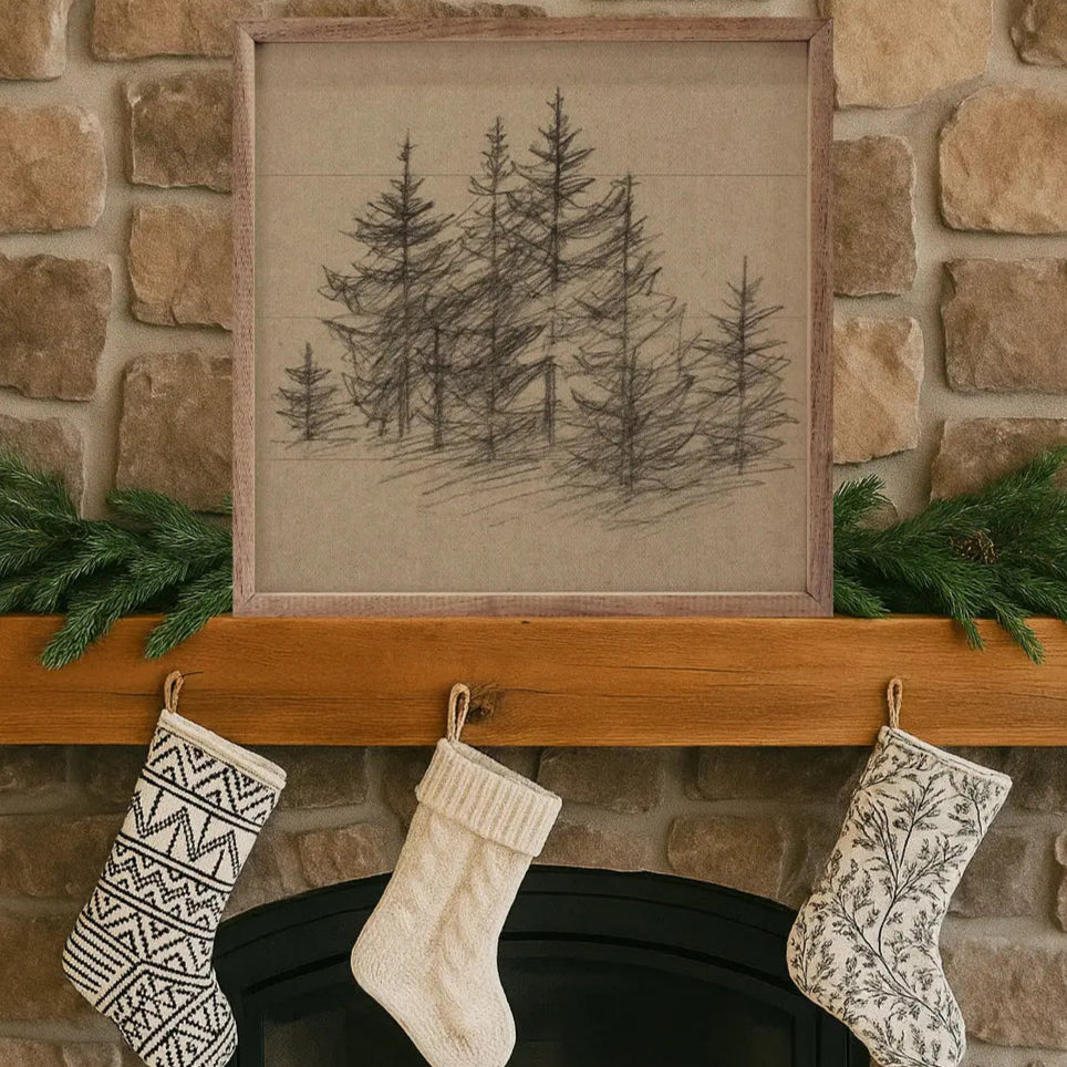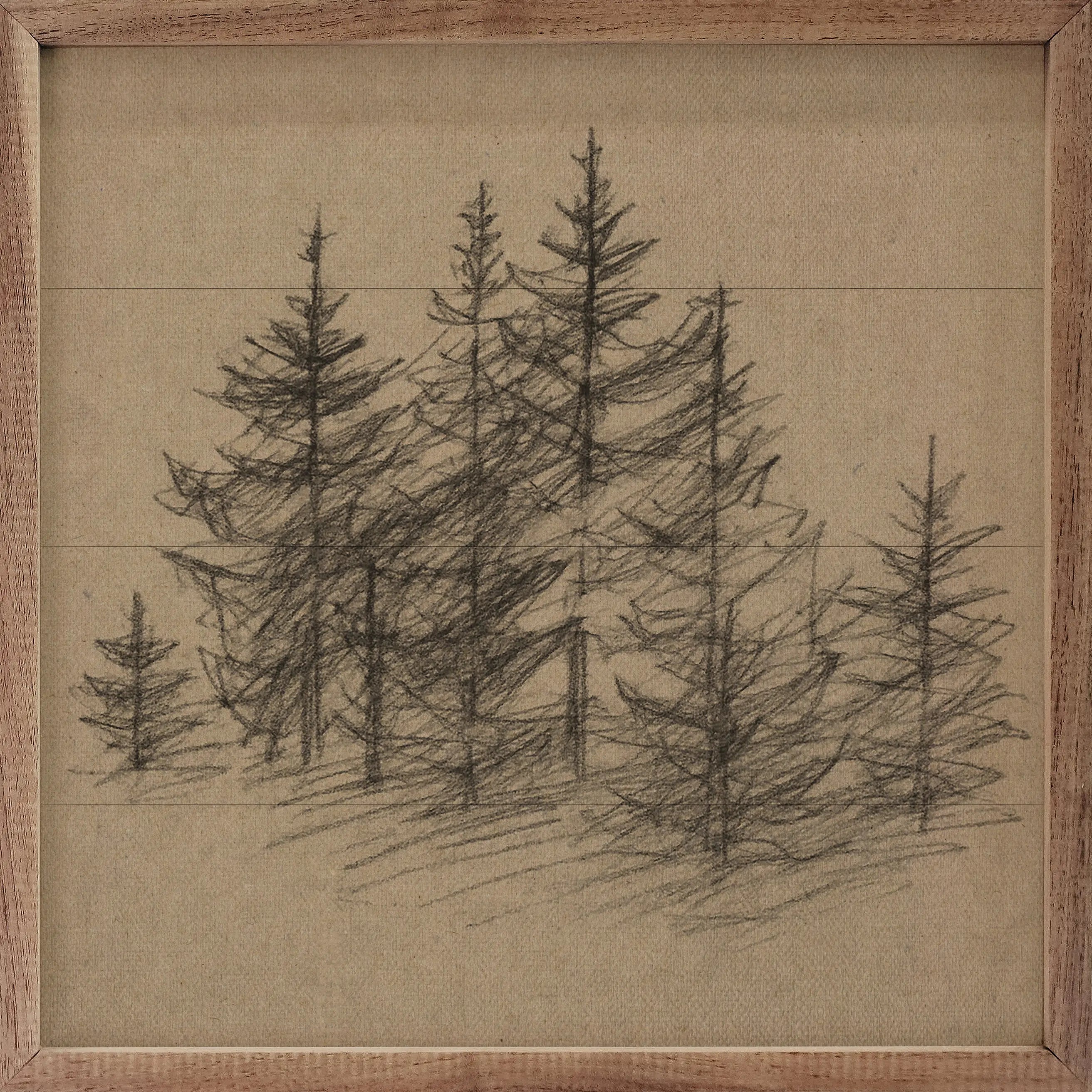 This vintage style pencil sketch captures a quiet grove of pines, simple and serene. Framed in warm walnut wood with a shiplap backdrop, it brings a peaceful, woodland charm to any space for the winter season.