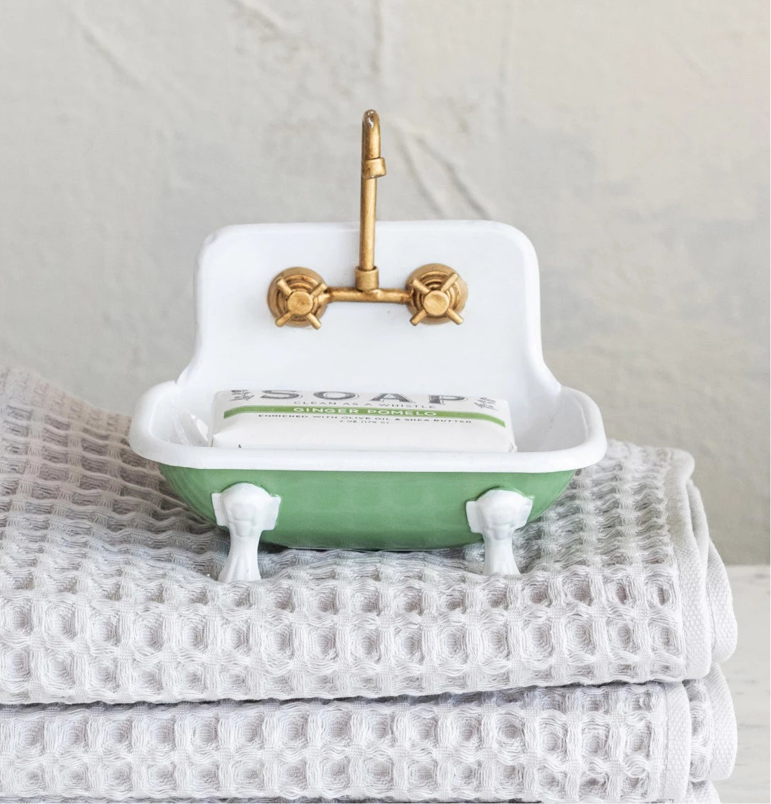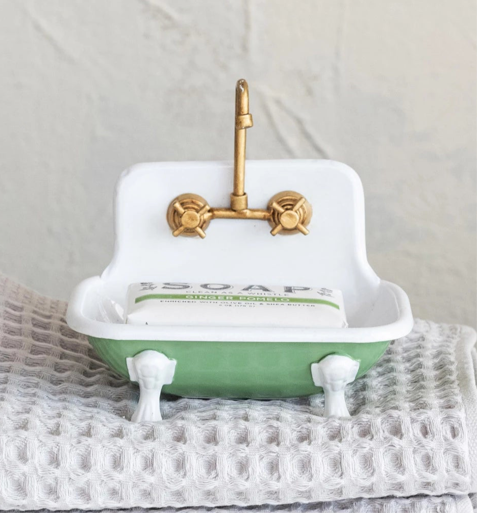 This sweet metal soap dish, shaped as vintage clawfoot sink in a beautiful mint green color, is sure to add a little vintage farmhouse charm to any bathroom or kitchen.