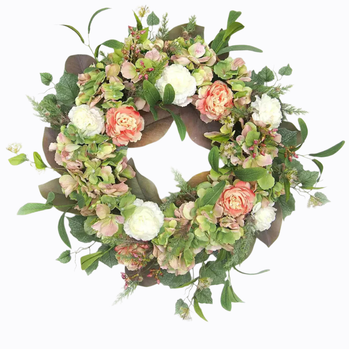 This artificial floral wreath, featuring pink and white florals with mixed greenery, is a beautiful choice for adding a touch of Spring with farmhouse charm to any place in your home.