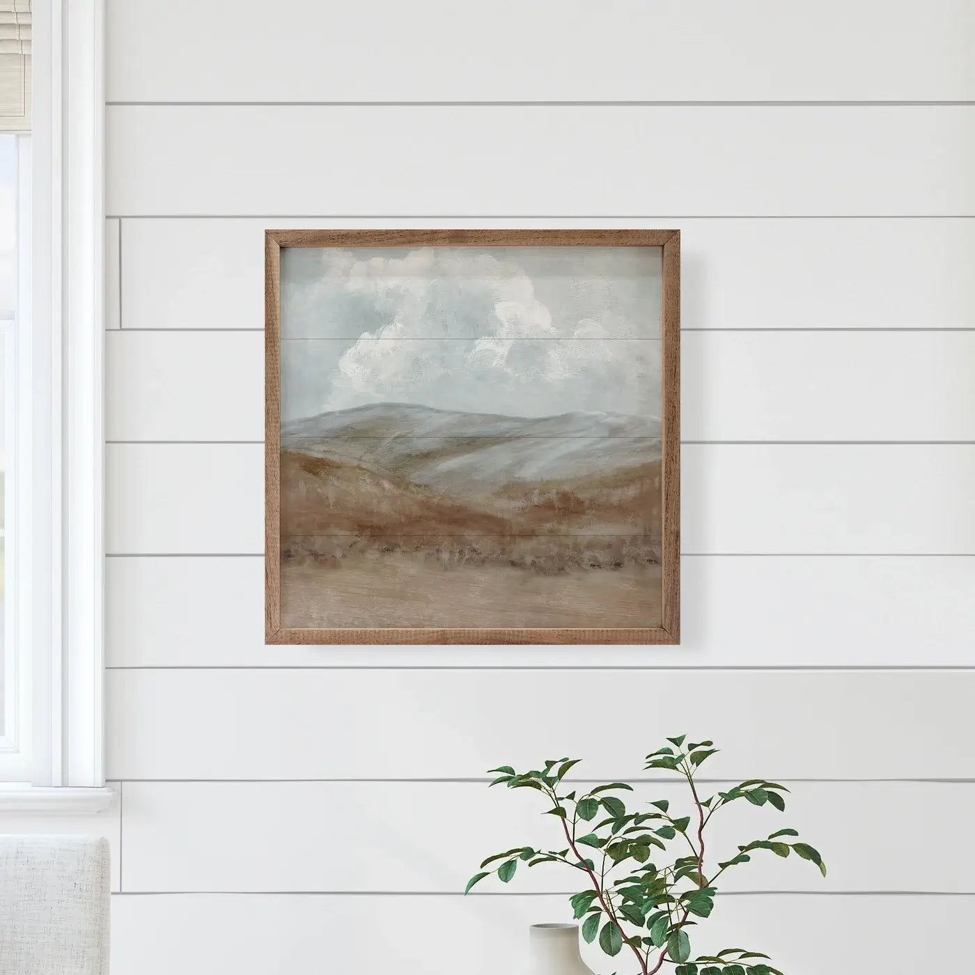 This vintage style wood print, featuring a walnut wood frame with the scenery of a peaceful rainy mountain printed on a shiplap background, is sure to provide beauty and farmhouse charm to any space.