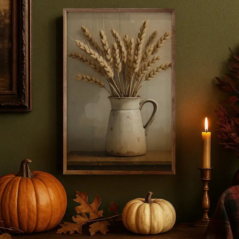 This charming piece features golden wheat arranged in a weathered white pitcher, set against a shiplap background and framed in warm walnut wood, it's a simple, rustic touch that feels right at home in any farmhouse space.