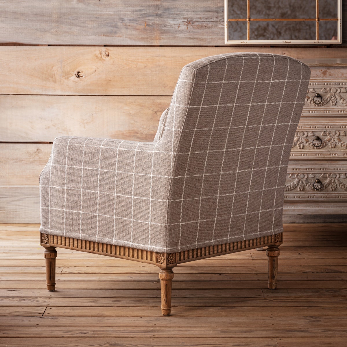 Our Window Pane Arm Chair is a beautiful and classic chair, featuring a warm tan fabric with a creamy white window pane pattern and carved wood details, this chair is sure to add comfort and elegance to any modern farmhouse style home.