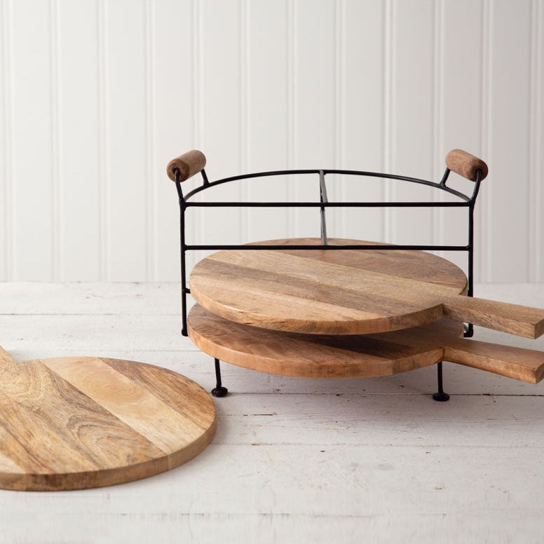 This wood cutting boards set, featuring three wood cutting boards with handles nestled in a metal stand with side wood handles, is perfect for adding a vintage farmhouse feel to any kitchen countertop while keeping your kitchen functional and organized.