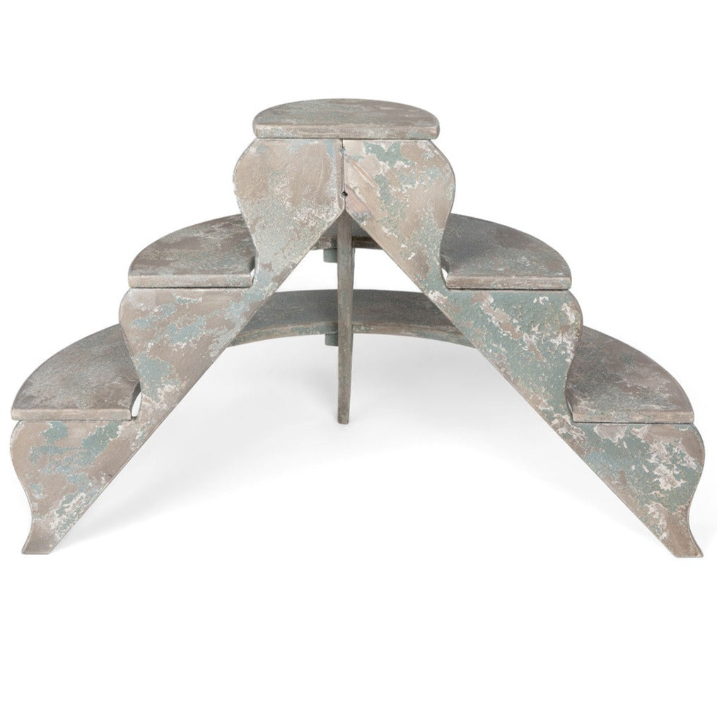 With three crescent tiers, this rustic wooden stand will add architectural appeal and dimensional interest to your assortment of potted plants, whether styled against a wall or atop a table for layered displays, this nearly three foot by two foot stand is sure to make a statement while adding beauty and function to your garden.