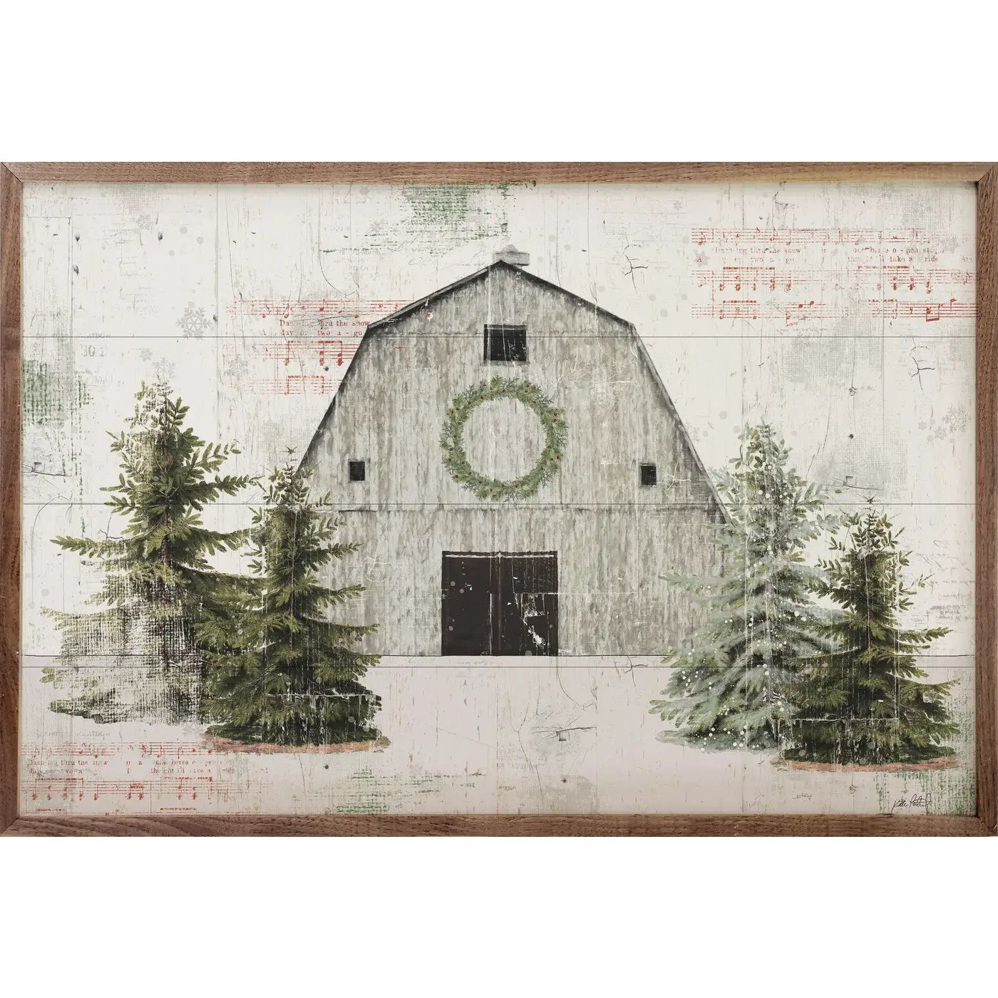 This vintage style wood print, featuring a walnut wood frame with a beautiful barn decorated with a center wreath printed on a distressed musical shiplap background, is sure to provide beauty and farmhouse charm to any space in your home this holiday season.