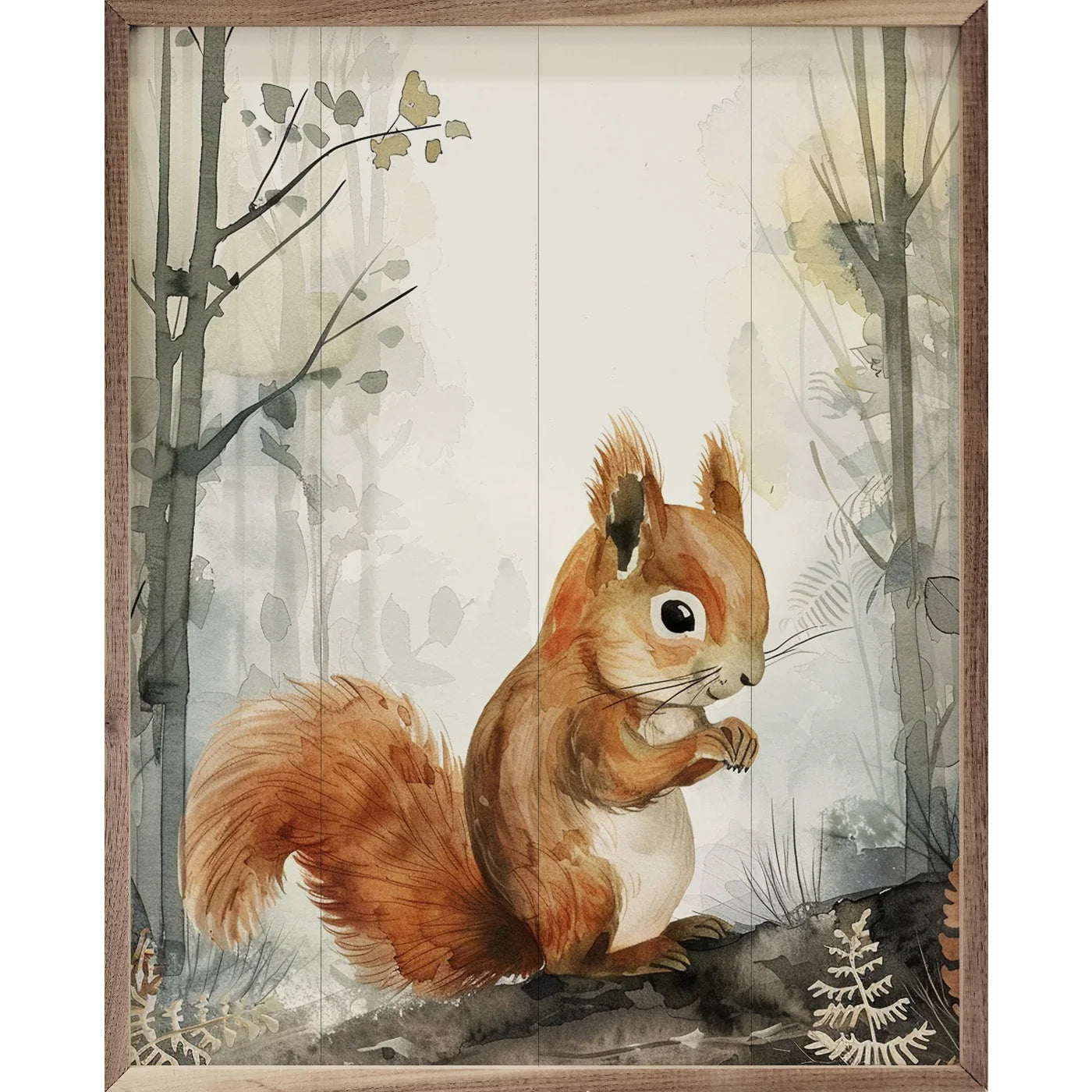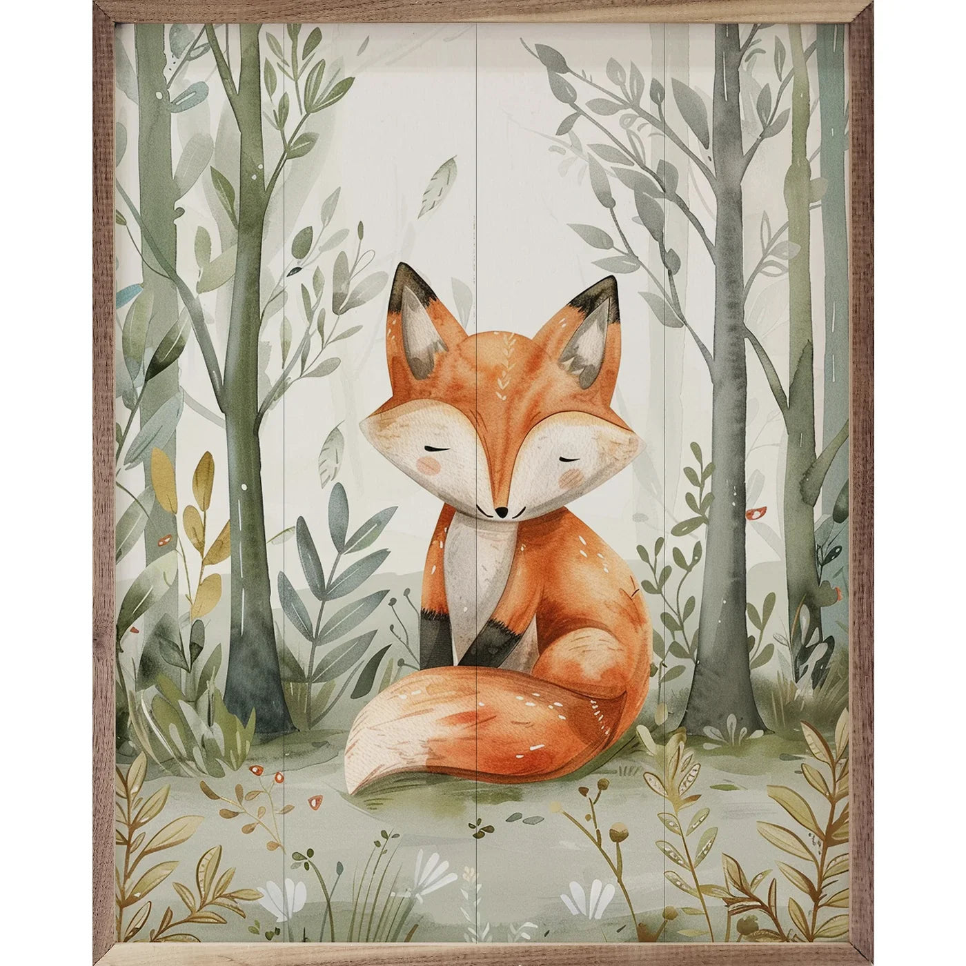 These whimsical style wood prints, featuring a walnut wood frame with an adorable watercolor print of different sweet animals foraging in a forest on a shiplap background, is sure to provide whimsy and farmhouse charm to any nursery or child's room.