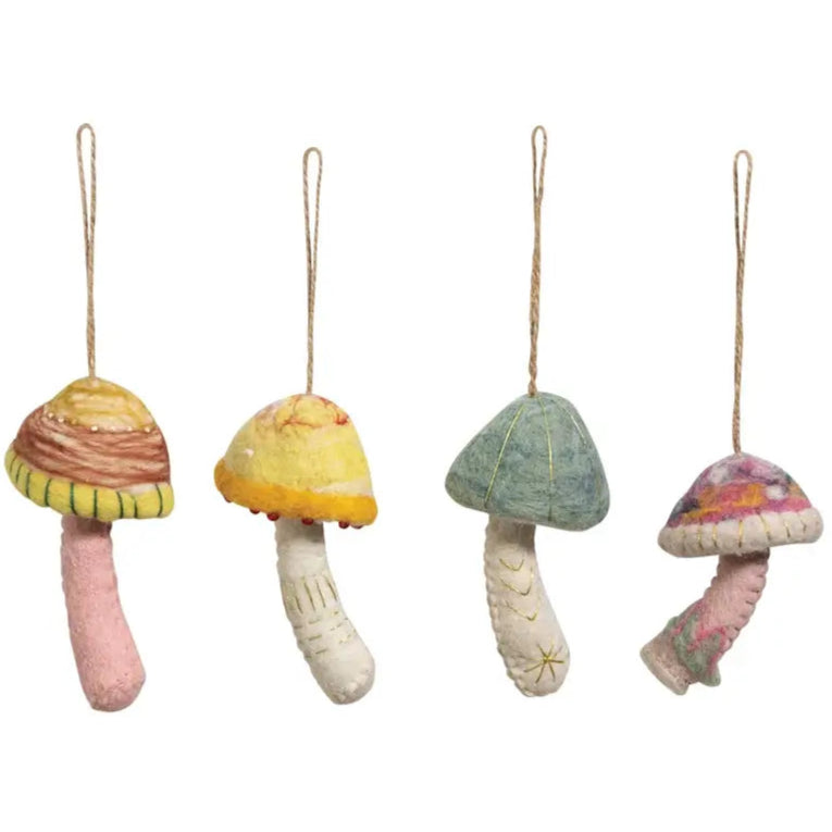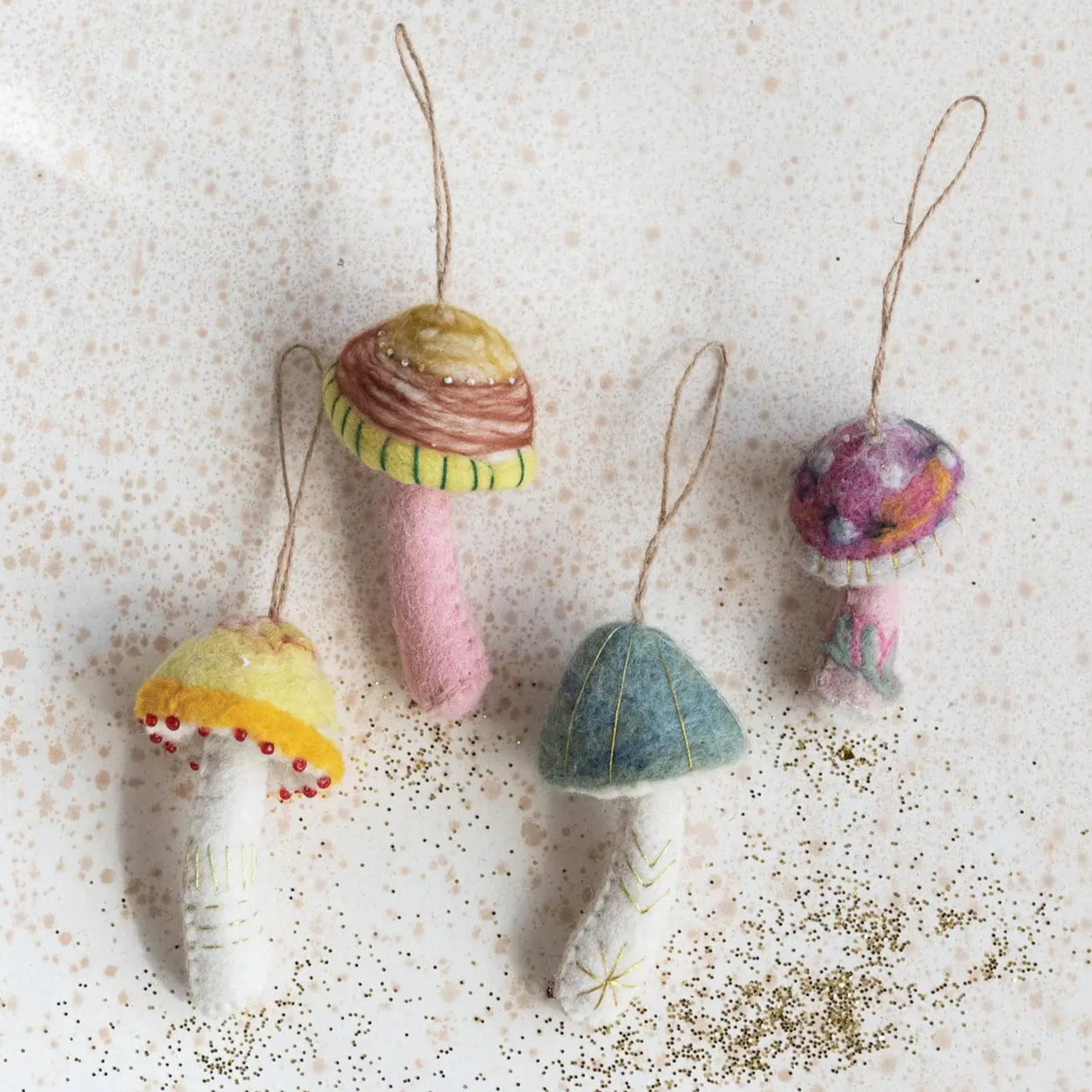 These handmade wool felt mushroom ornaments are full of woodland charm, with tiny beads and metallic thread adding a touch of sparkle to each one, they are whimsical and fun for any festive Cottagecore styled holiday display!