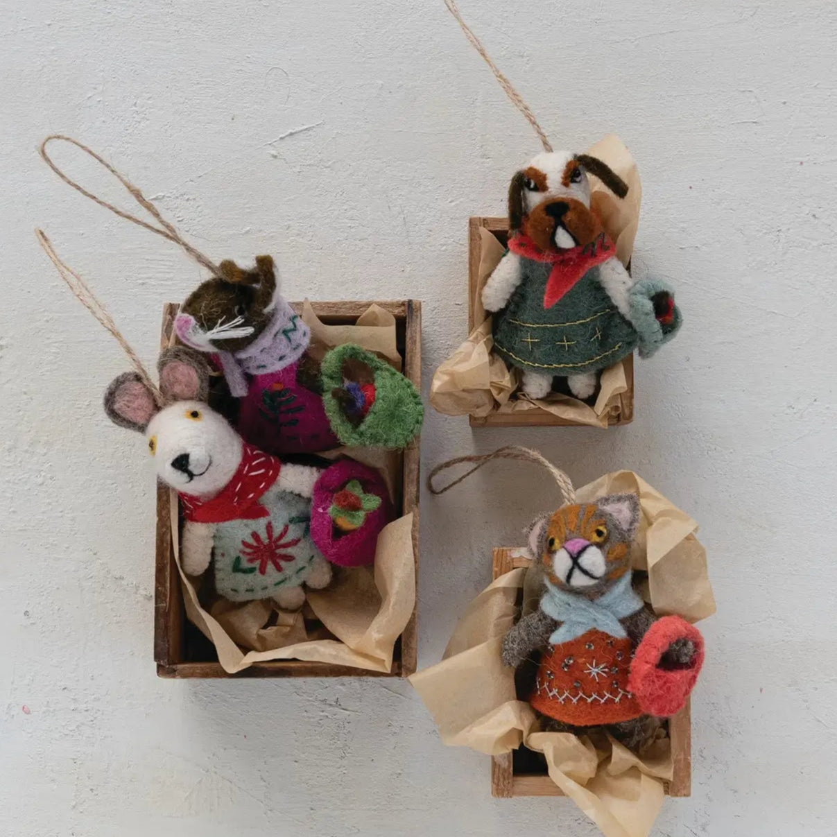 These wool felt animal ornaments are full of personality and handmade charm, each one is dressed in a cozy, embroidered outfit complete with scarves and tiny market baskets, perfect for adding a touch of cottage whimsy to your holiday tree.