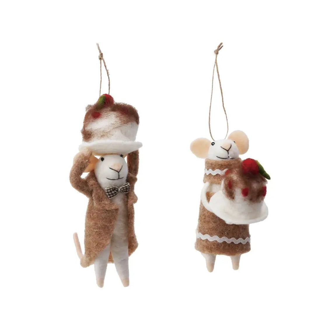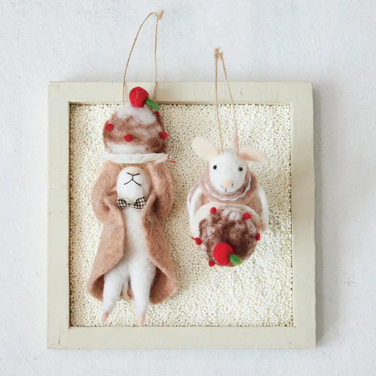 Deck your home this holiday season in whimsical farmhouse style with these sweet wool felt mice, each holding an adorable little holiday cake.